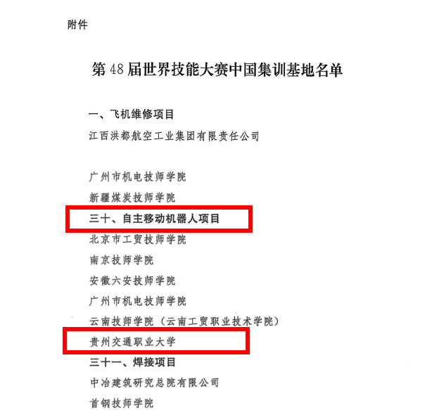 近日,中华人民共和国人力资源和社会保障部发布《关于确定第48届世界技能大赛中国集训基地的通知》,我校成功入选第48届世界技能大赛中国集训基地自主移动机器人项目。
