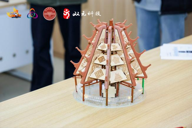 我校作品《榫卯乾坤 数字传承》以侗族木构非遗技艺为核心,创新融合3D打印、激光雕刻与智能交互技术,精准复刻肇兴侗寨鼓楼“无钉无铆”榫卯结构,通过有限元分析优化力学性能,结构误差控制在±0.05mm 以内,配套LED光影与语音讲解模块,实现传统文化沉浸式传播。作品既响应文化强国战略,又为非遗数字化传承提供可复制方案,彰显我校在跨学科人才培养中的显著成效。