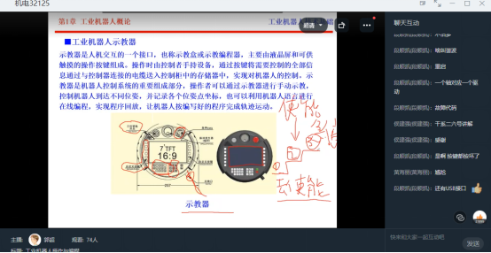 郭超老师为解决线上教学中学生对机器人的认识和感受不够切实、具体的问题,结合大量的现场图片、动画视频等资源丰富教学内容,例如进行“示教器”知识点讲授时,通过“游戏手柄”的比喻使得学生对专业知识点具有了更加直观和具体的感受,讲解按钮及功能时贯穿了安全教育,并激励大家在疫情期间营造积极的学习心态。