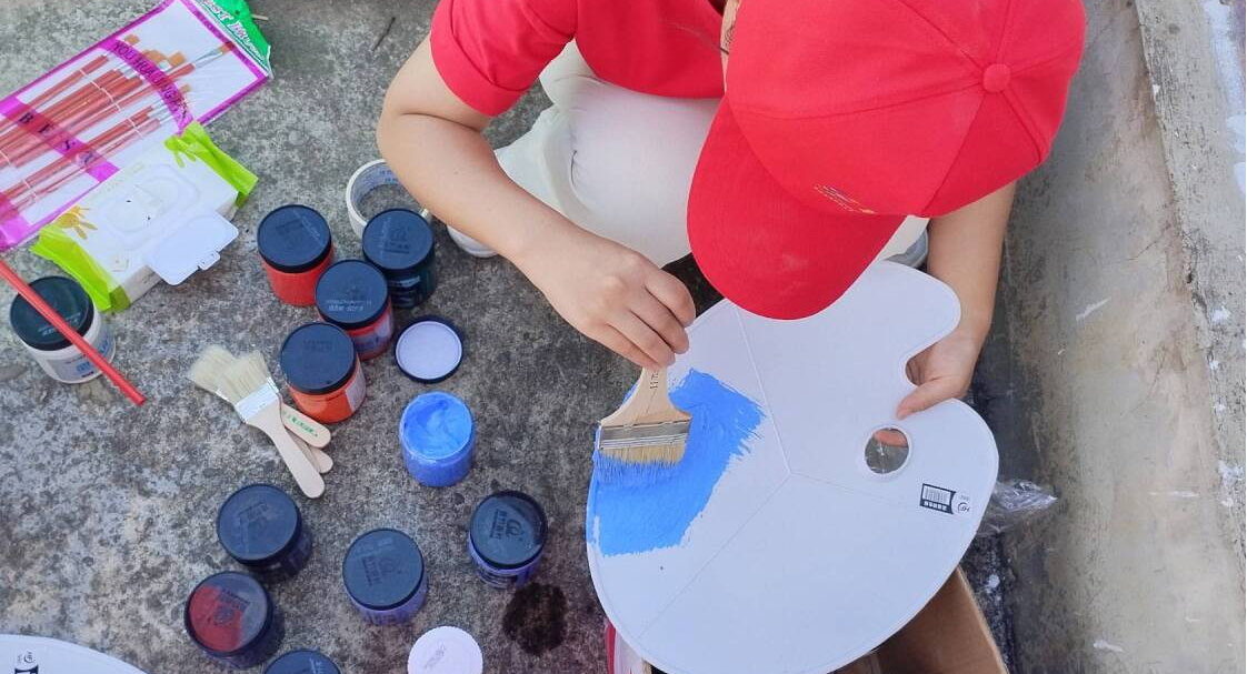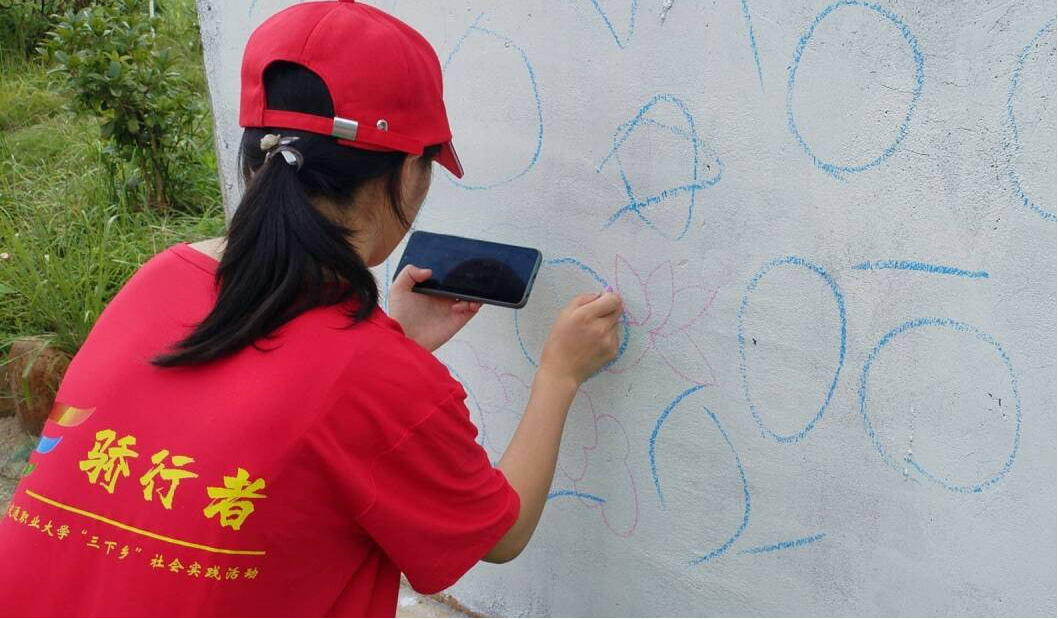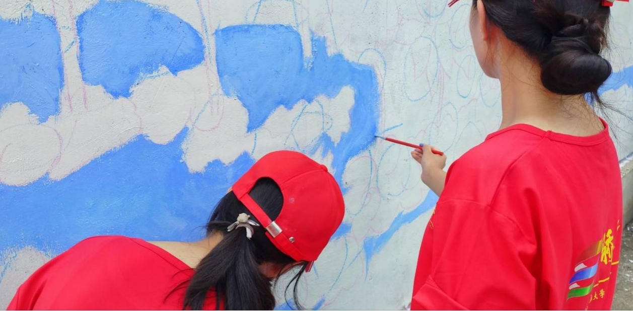 蝉鸣山海,夏令悠长,墙绘小队顶着烈日,为了更好进行墙绘的绘画工作,她们在墙上画圈定位。不断跟手中设计草图反复对比,在调色盘上巧妙的混合各种颜色,生成七彩斑斓的颜色,开启属于今天的墙绘之旅。一笔一画,勾勒墙绘轮廓,把最美的画作展现在墙面上,手绘墙绘画出希望与美好的种子,队员们用自己认真的态度表达着对活动的热情。