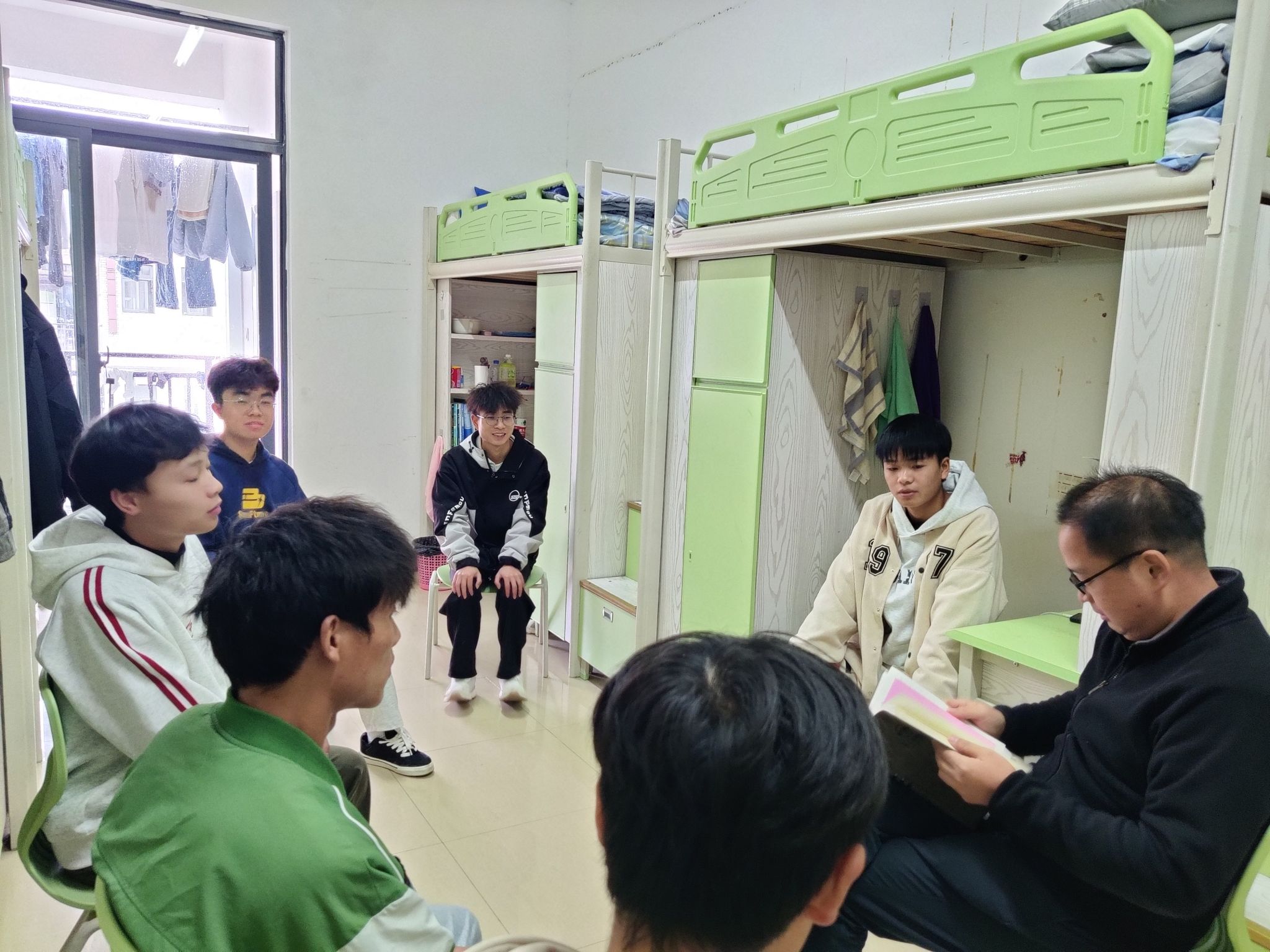 于建委在寝室和同学谈心时,认真聆听了同学们进校2个月以来在生活、学习中的感受,针对同学们反馈的食堂饭菜、教室卫生、校园活动等方面的疑惑进行了详细的解答,还和同学们交流了学习目标、实施路径、就业目标及第二课堂等内容。