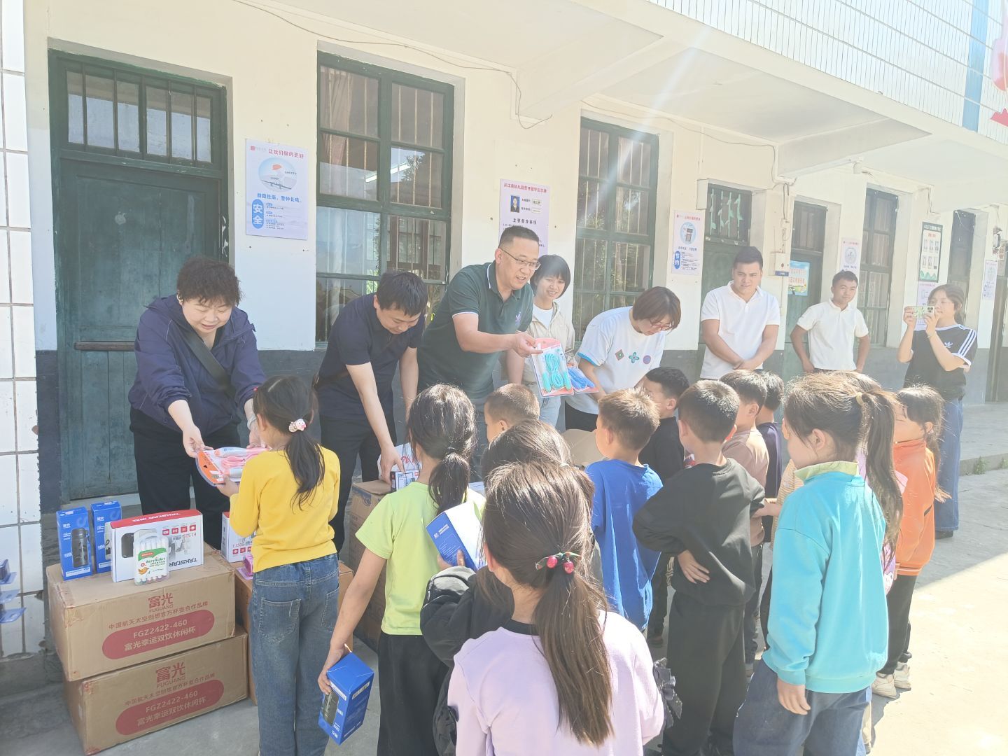 张启建、吴薇一行还向陇里村幼儿园、陇里小学捐赠了文具盒、削笔刀、马克笔、三角板、保温杯等学习用品和乒乓球拍、跳绳、篮球、足球等体育用品。